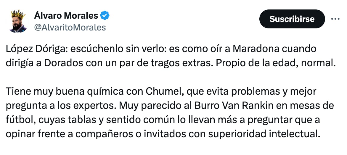 A través de sus redes sociales, Álvaro Morales le respondió al Burro Van Rankin, asegurando que le falta capacidad lectora y de comprensión, pues según él, lo alabó, no lo criticó.