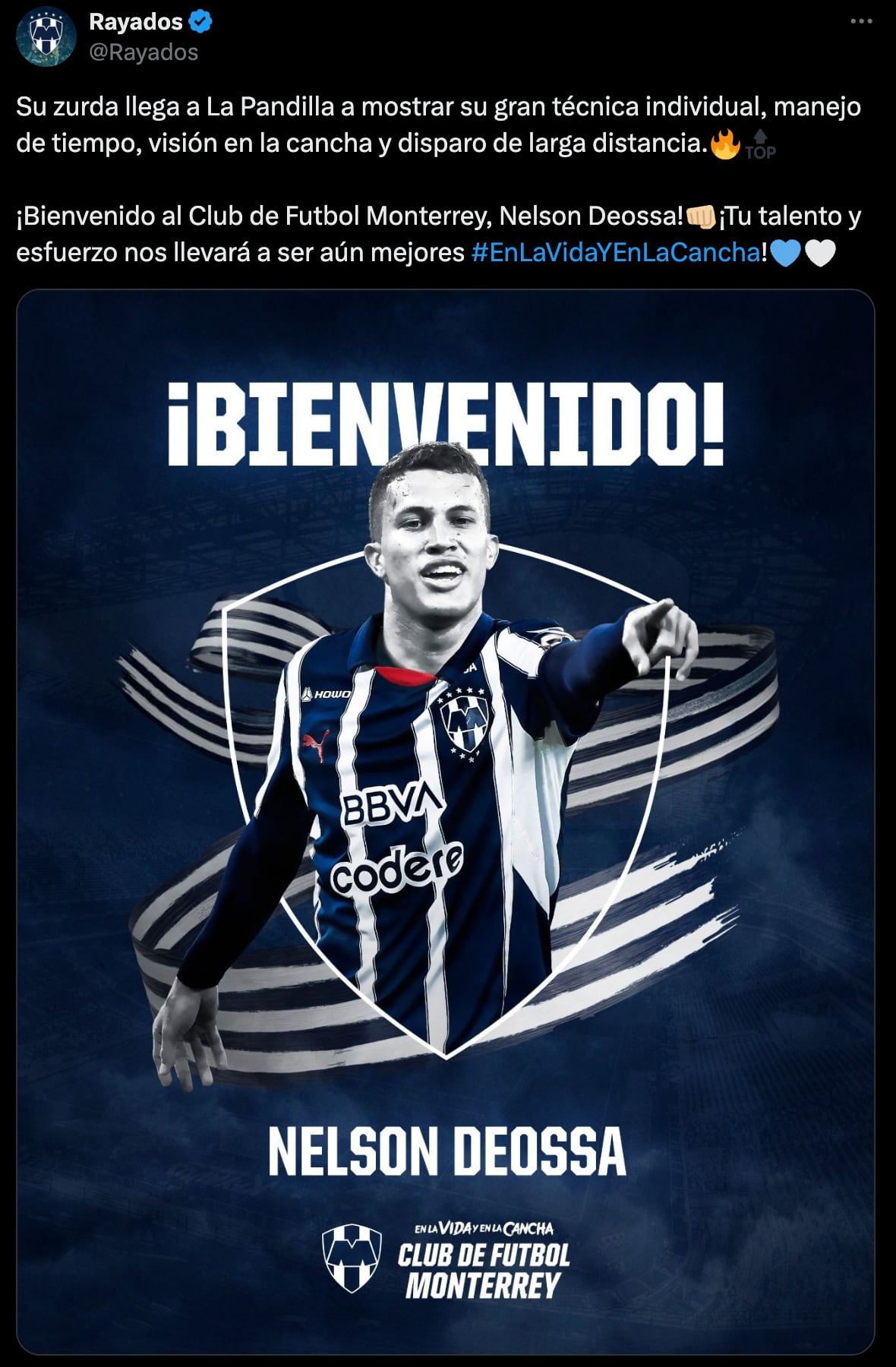 “Su zurda llega a La Pandilla a mostrar su gran técnica individual, manejo de tiempo, visión en la cancha y disparo de larga distancia. ¡Bienvenido al Club de Futbol Monterrey, Nelson Deossa! ¡Tu talento y esfuerzo nos llevará a ser aún mejores!”, escribió Rayados de Monterrey en su cuenta de X.