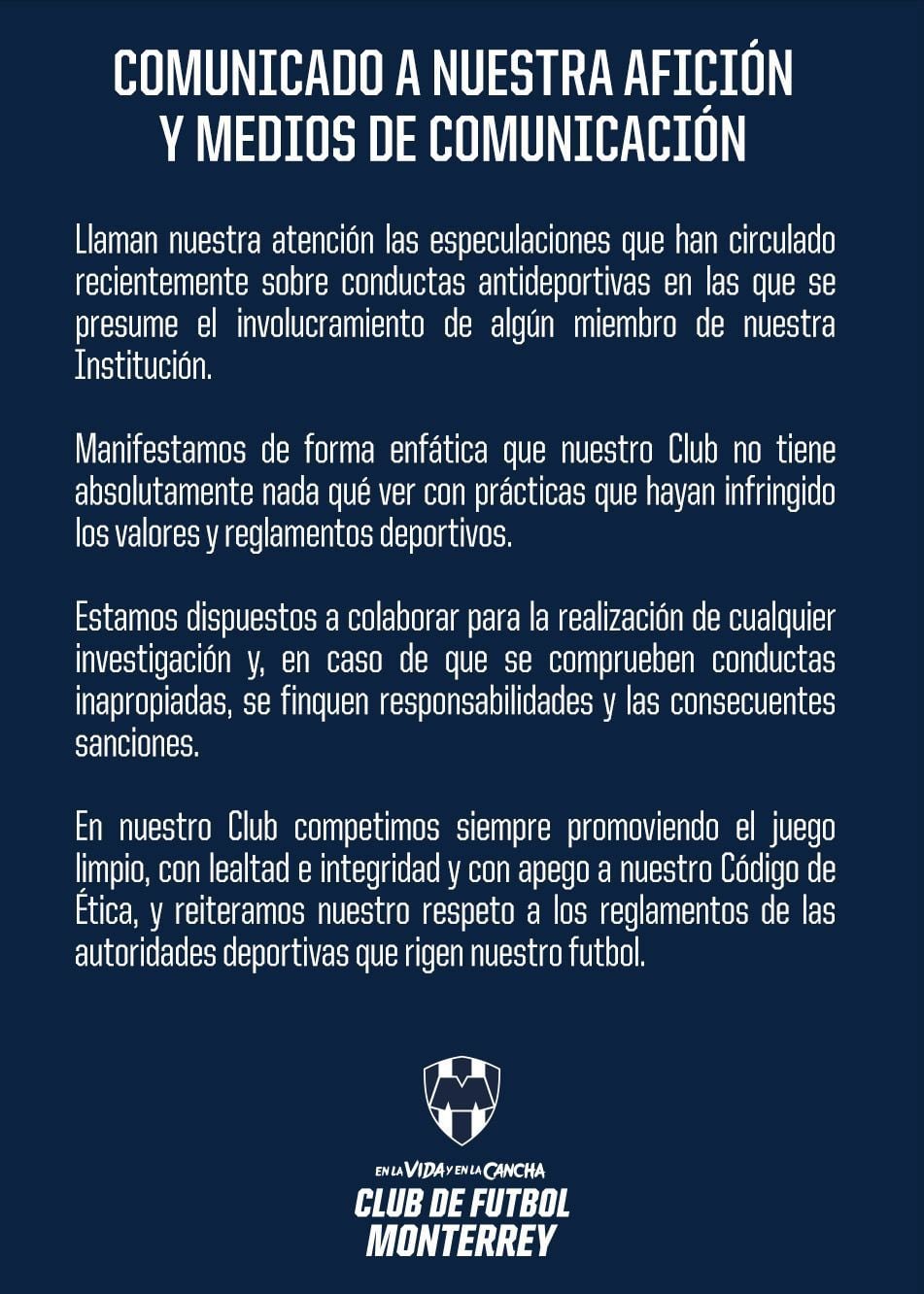“Manifestamos de forma enfática que nuestro Club no tiene absolutamente nada qué ver con prácticas que hayan infringido los valores y reglamentos deportivos”, se lee en el comunicado respecto al caso de Robert Dante Siboldi con el Club Tigres.