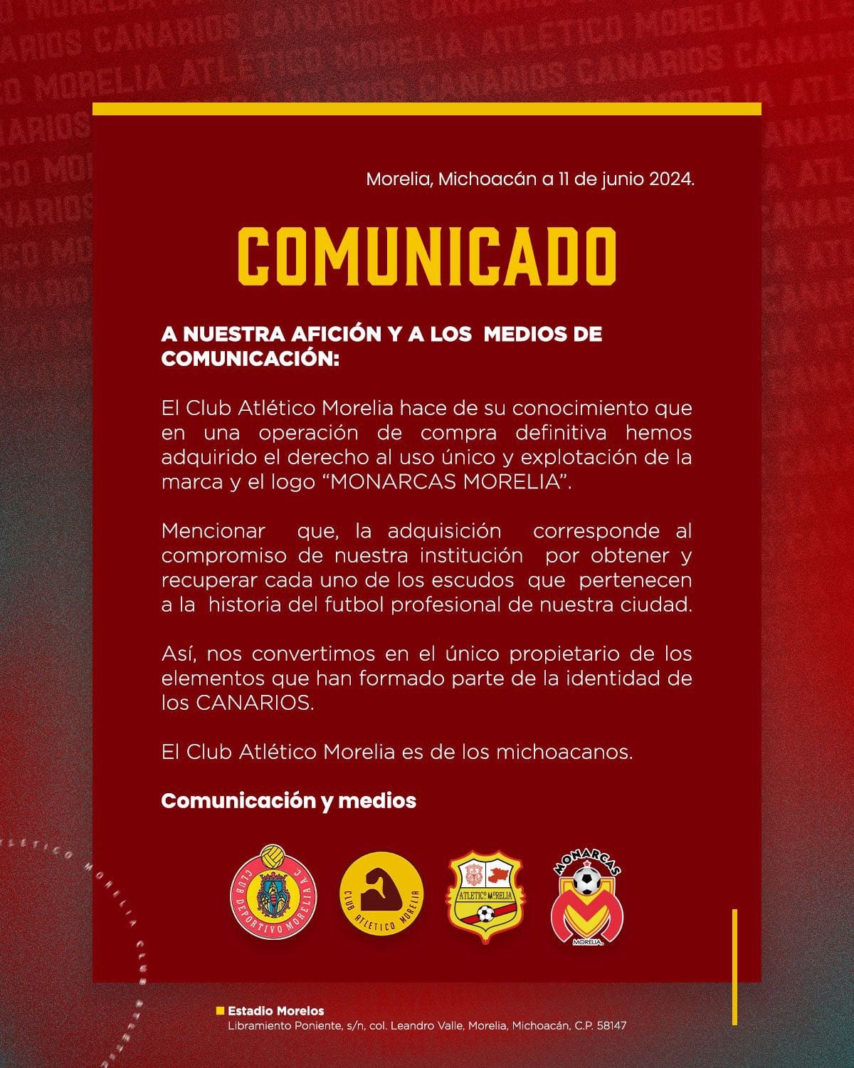 “Quiero compartirles con mucha emoción que hemos adquirido todo lo relacionado a Monarcas, ha sido un esfuerzo económico/financiero muy importante pero es fundamental para nuestra afición y estado el tener toda la historia de futbol del Club Atlético Morelia”, escribió José Luis Higuera en su cuenta de X.