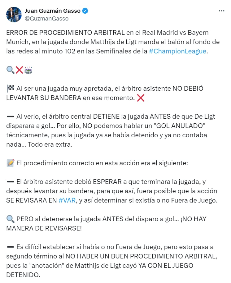 “Al ser una jugada muy apretada, el árbitro asistente no debió levantar su bandera en ese momento. Al verlo, el árbitro central detiene la jugada antes de que De Ligt disparara a gol... Por ello, no podemos hablar un “Gol anulado” técnicamente, pues la jugada ya se había detenido y ya no contaba nada... Todo era extra”, aseguró.