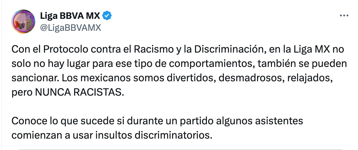 “Con el Protocolo contra el Racismo y la Discriminación, en la Liga MX no solo no hay lugar para ese tipo de comportamientos, también se pueden sancionar. Los mexicanos somos divertidos, desmadrosos, relajados, pero NUNCA RACISTAS. Conoce lo que sucede si durante un partido algunos asistentes comienzan a usar insultos discriminatorios”, se lee en la publicación.