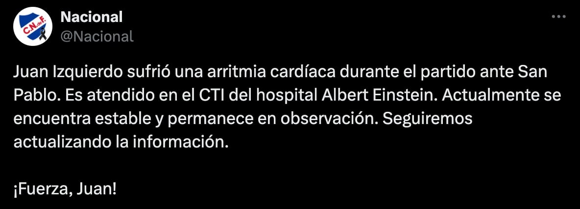 “Juan Izquierdo sufrió una arritmia cardíaca durante el partido ante San Pablo. Es atendido en el CTI del hospital Albert Einstein. Actualmente se encuentra estable y permanece en observación”, escribió el Nacional de Uruguay.