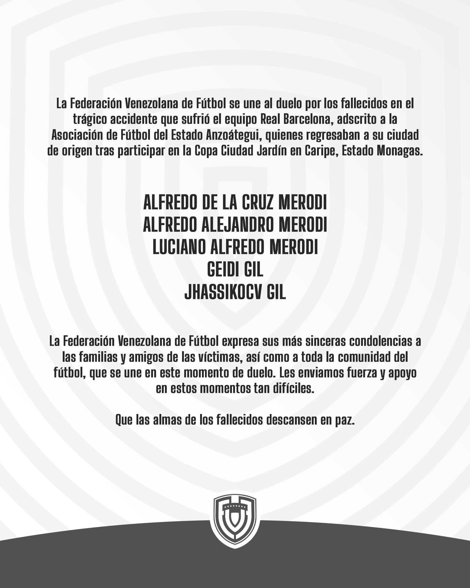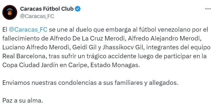 “El Caracas FC se une al duelo que embarga al futbol venezolano por el fallecimiento de Alfredo De La Cruz Merodi, Alfredo Alejandro Merodi, Luciano Alfredo Merodi, Geidi Gil y Jhassikocv Gil, integrantes del equipo Real Barcelona, tras sufrir un trágico accidente luego de participar en la Copa Ciudad Jardín en Caripe, Estado Monagas. Enviamos nuestras condolencias a sus familiares y allegados”, escribió el equipo en sus redes sociales.