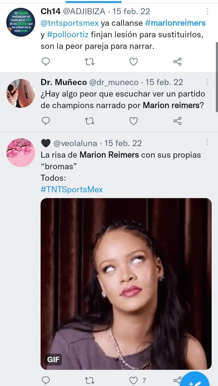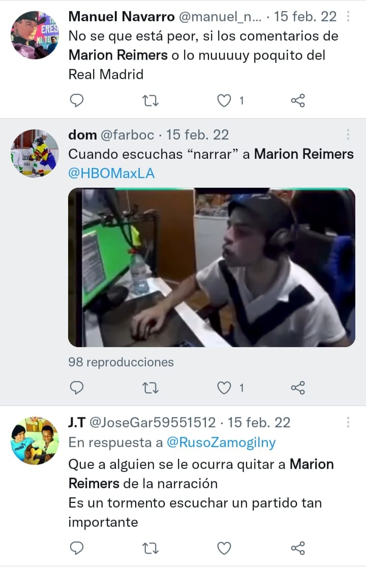 J.T. @JoseGar59551512. “Que a alguien se le ocurra quitar a Marion Reimers de la narración. Es un tormento escuchar un partido tan importante”.