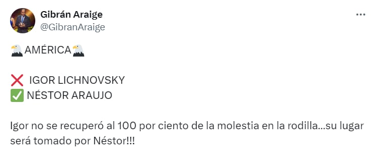 De acuerdo a información de Gibrán Araige de TUDN, Igor Lichnovsky no se recuperó al 100 por ciento de la molestia que presentó en la rodilla, por lo que no iniciará como titular en el Club América vs Club Chivas de las semifinales de la Liga MX.