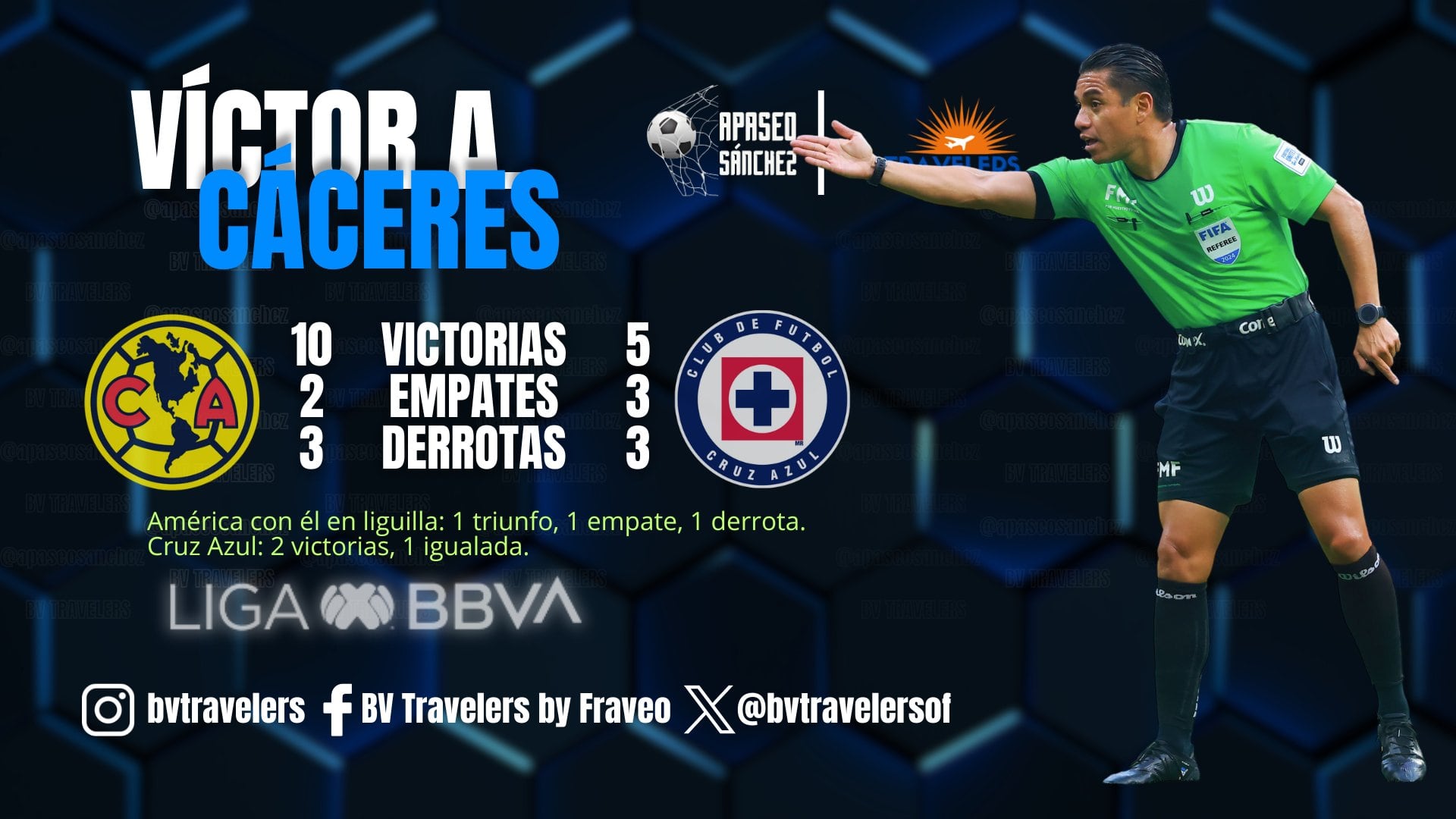 Lo que también es un hecho es que, en lo general, a América le va bien con este árbitro en campo debido a que tienen 10 victorias, dos empates y tres derrotas cuando Víctor Cáceres imparte justicia. En tanto Cruz Azul tiene cinco juegos ganados, tres empatados y tres perdidos cuando él pita.