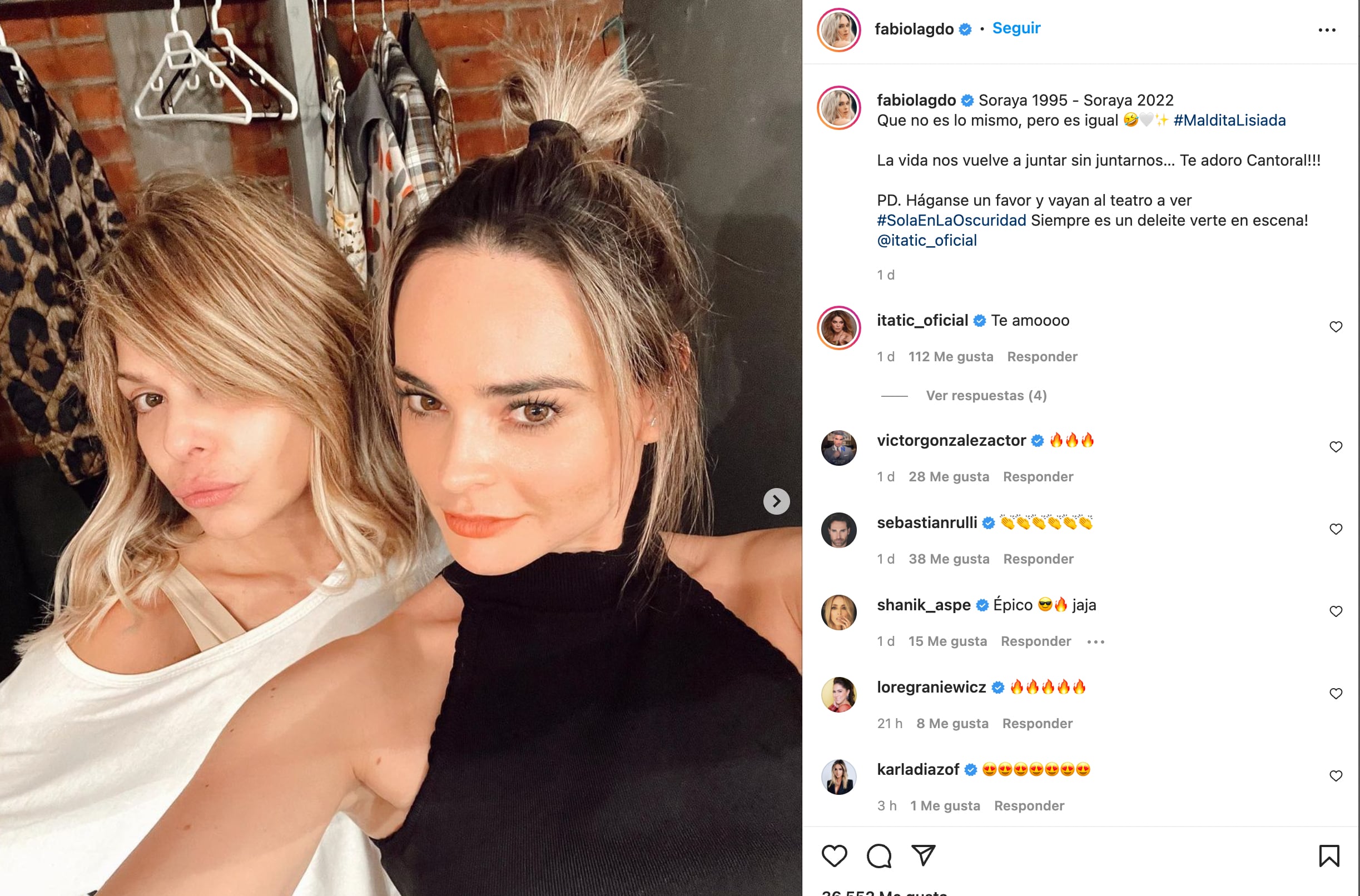 Menciona que la vida las había vuelto a juntar y aprovechó para invitar al público a la obra “Sola en la oscuridad” donde actua Itatí Cantoral y escribió que siempre era un deleite verla en el escenario.