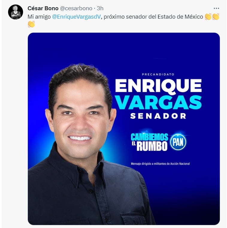 Mi amigo @EnriqueVargasdV, próximo senador del Estado de México”, agregó César Bono en sus publicaciones de redes sociales.