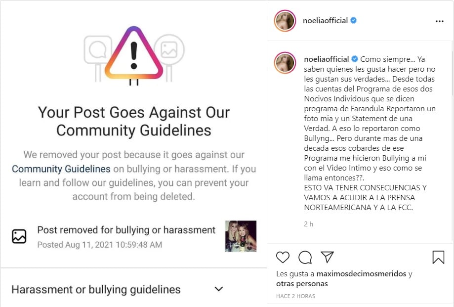 Tras hacer esta publicación, la red social de Instagram eliminó este post de Noelia y señaló que rompe las reglas y normas de la plataforma.