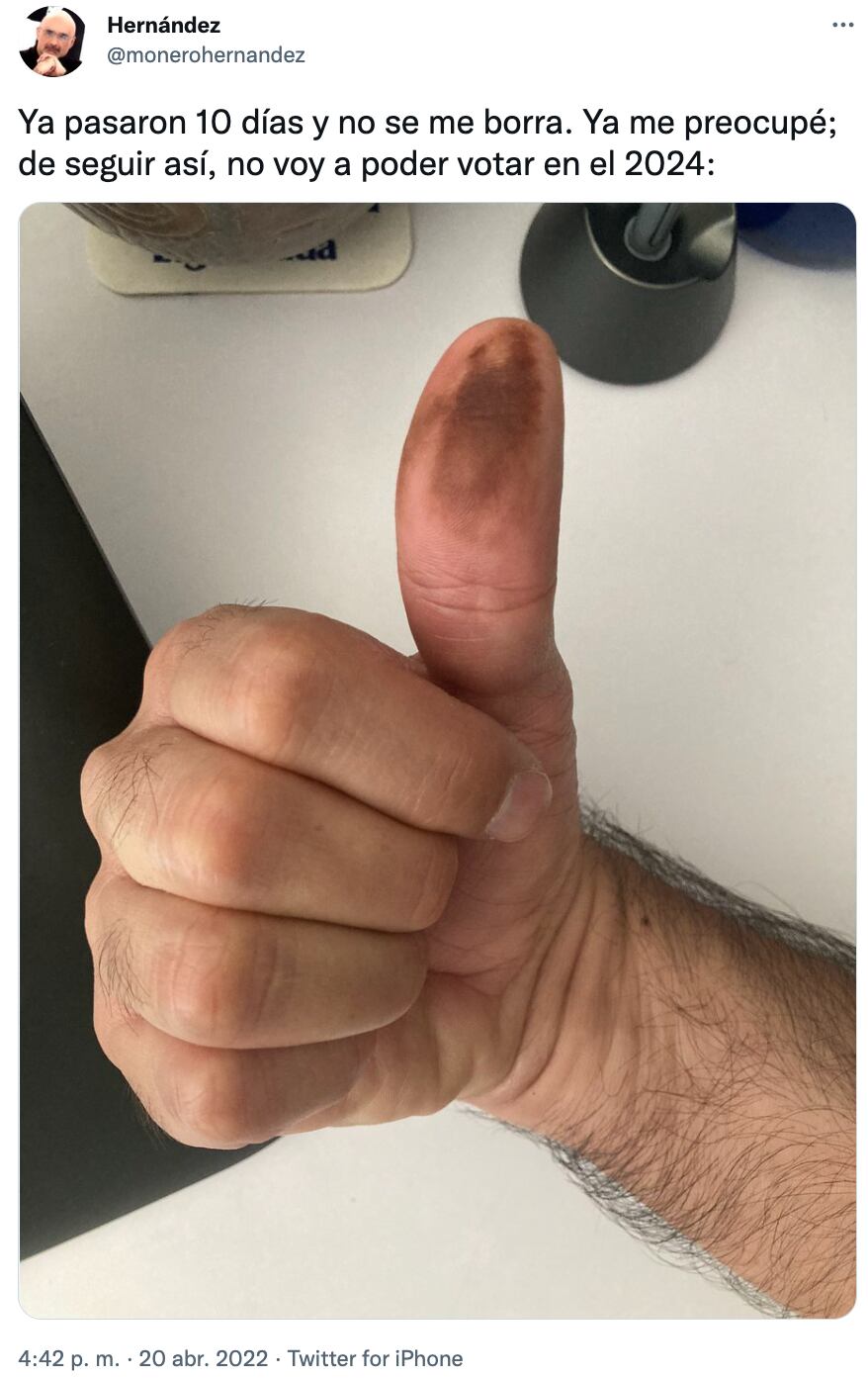 José Hernández, el Monero Hernández, compartió que, desde que participó en el ejercicio de revocación de mandato, no se le ha borrado la tinta del pulgar.