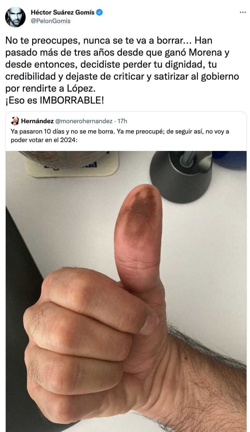 Héctor Suárez Gomís ahora insultó al Monero Hernández luego de que este compartiera que no ha podido quitar la tinta indeleble de su pulgar desde la revocación de mandato.