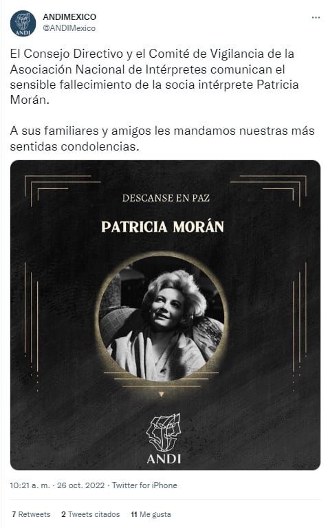 Aunque no se notificó el motivo de la muerte de Patricia Morán, el anunció de la ANDI en redes sociales mandaba sus “sentidas condolencias” para los familiares y amigos de la actriz mexicana.