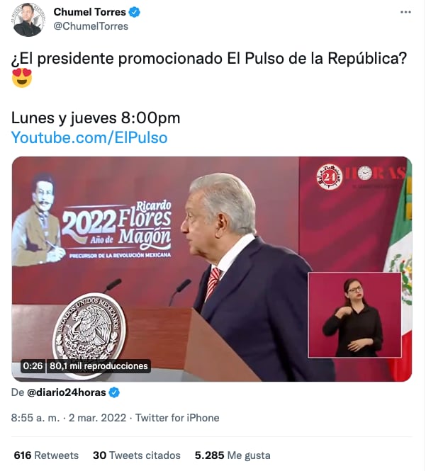 Tras esto, el nuevo ideólogo del conservadurismo compartió un tuit, en el cual ironizó que AMLO estaba promocionando al “Pulso de la República”.