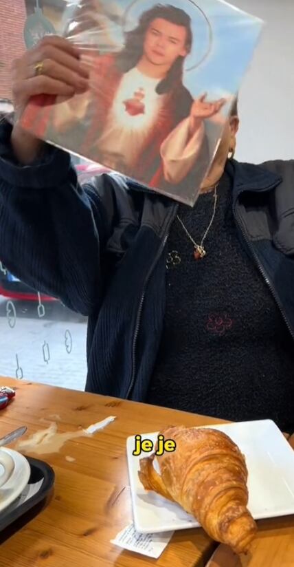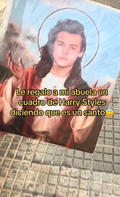 En TikTok hay un video de una nieta que le regala a su abuelita una imagen de Harry Styles y le dice que es un santo.