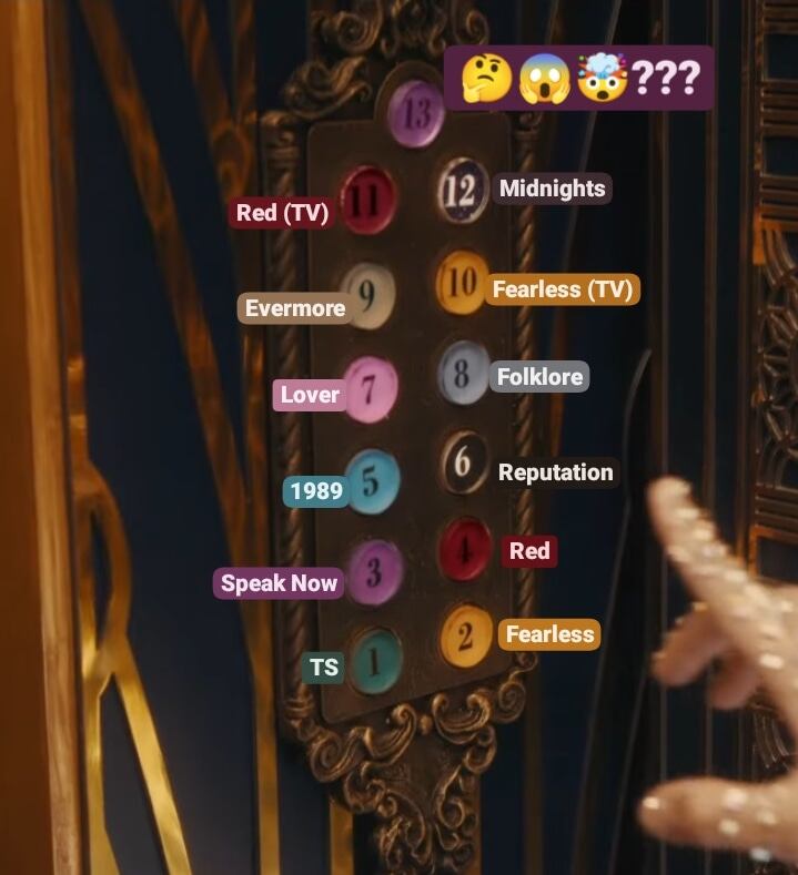 - En el elevador del video de ‘Bejeweled’ de Taylor Swift, hay 13 botones refiriéndose a todos sus álbumes y ella aprieta el número 3 que está en color morado. Speak Now fue su tercer álbum y su color fue el morado.