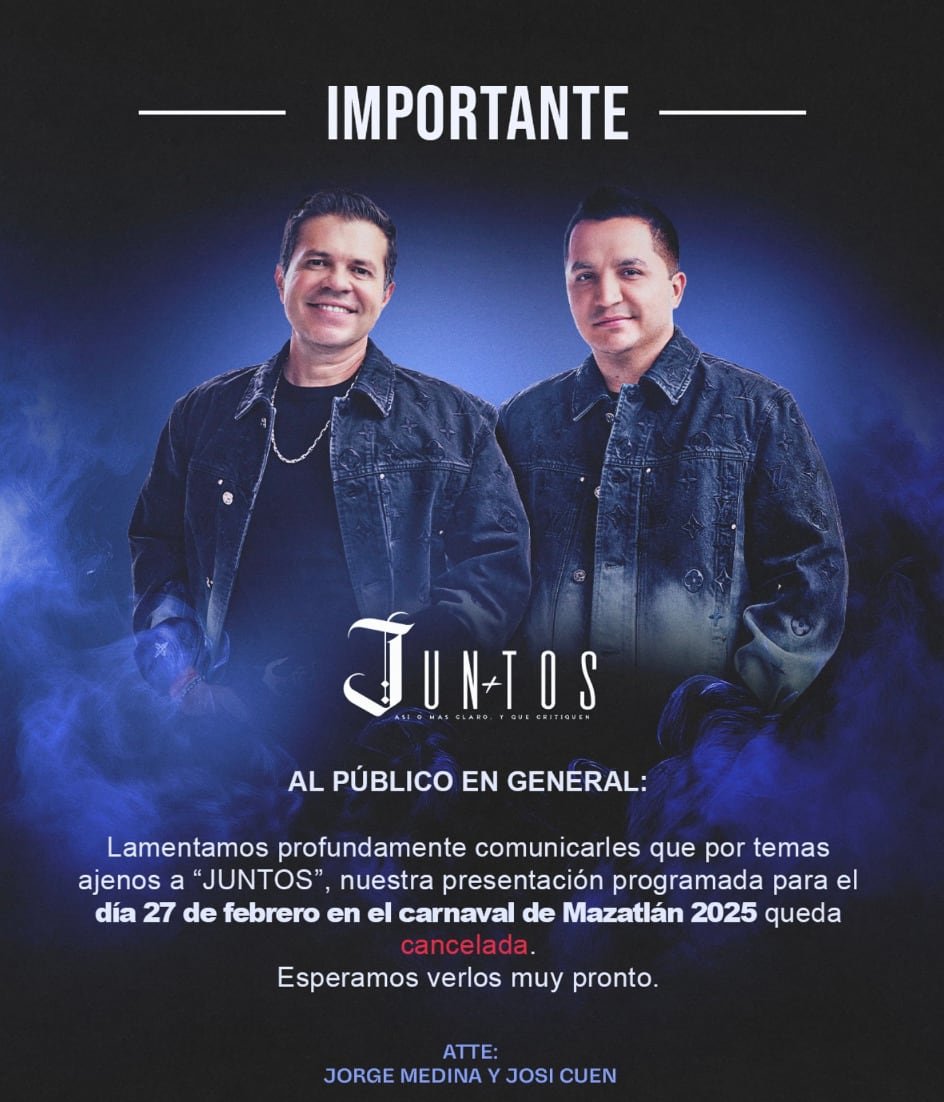 “Lamentamos profundamente comunicarles que por temas ajenos a ‘Juntos’, nuestra presentación programada para el día 27 de febrero en el Carnaval de Mazatlán 2025 queda cancelada”
