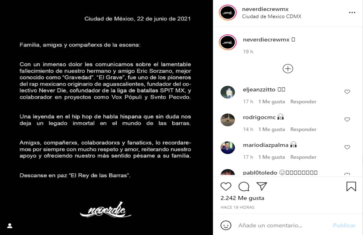 Además, se lee en el comunicado Grave fue “uno de los pioneros del rap mexicano”, fundador del colectivo Never Die y cofundador de la liga de batallas SPIT MX.