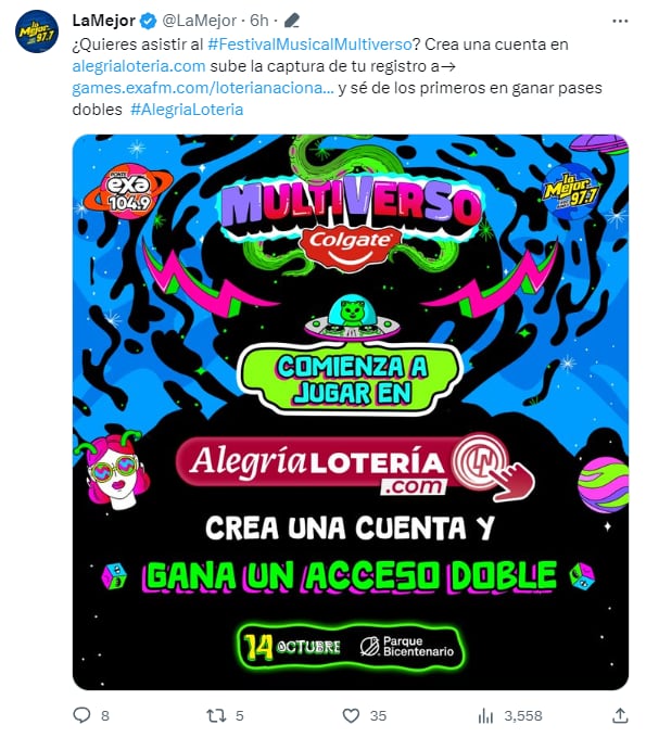 Como mencionamos, el Multiverso Colgate 2023 es gratis. Para conseguir boletos tienes que seguir las redes sociales de EXA FM y La Mejor FM.