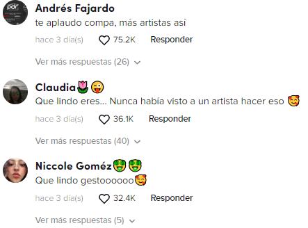 “Te aplaudo compa, más artistas así” , “Qué lindo eres... Nunca había visto a un artista hacer eso” o “Ese si es un verdadero artista, no los que se enojan y echan a sus guaruras por delante, felicidades y Dios los bendiga, bro”.