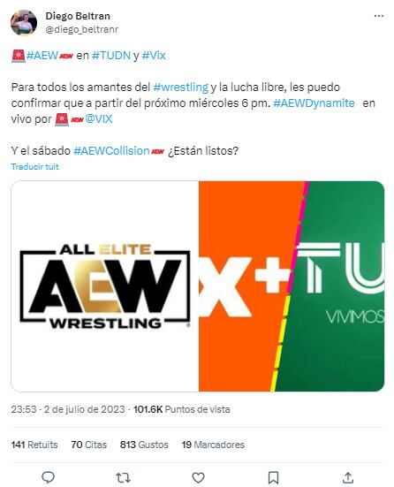 A través de su cuenta de Twitter, Diego Beltrán (@diego_beltranr) confirmó que la All Elite Wrestling llega a la plataforma de ViX.