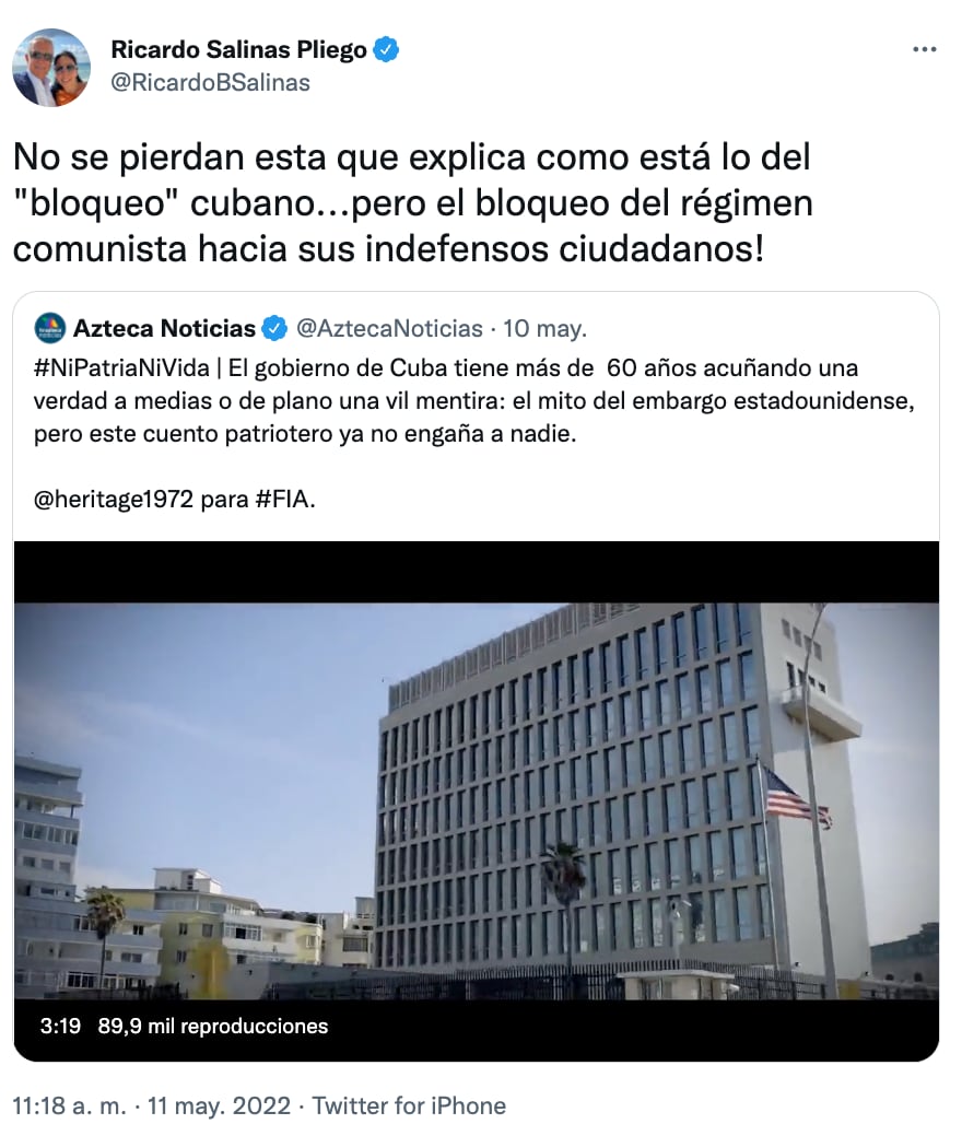 Sin embargo, el reportaje ordenado por Ricardo Salinas para su producción en TV Azteca, denominado “Ni Patria ni Vida”, asegura que el embargo de Estados Unidos es “un cuento patriotero” que no engaña a nadie.