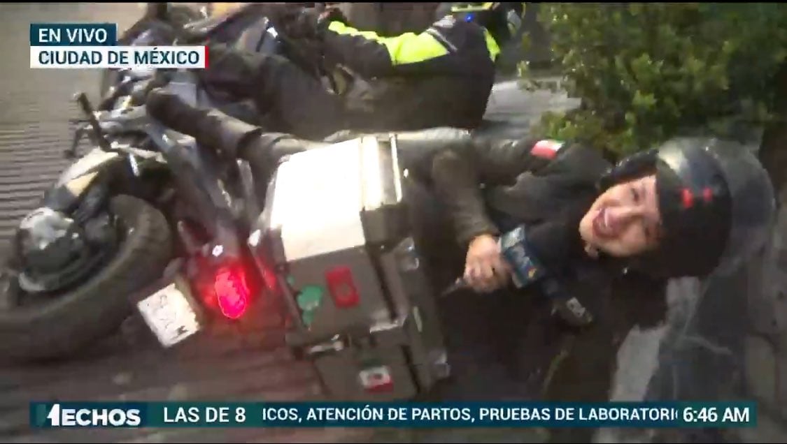 No obstante, la transmisión de esa reportera de TV Azteca se interrumpe cuando al intentar subir esa calle, se queda a medio camino y cae.
