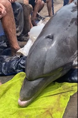 El primer delfín en ser rescatado, fue un macho adulto con un peso aproximado de 300 kilogramos y una edad estimada de 30 años.
