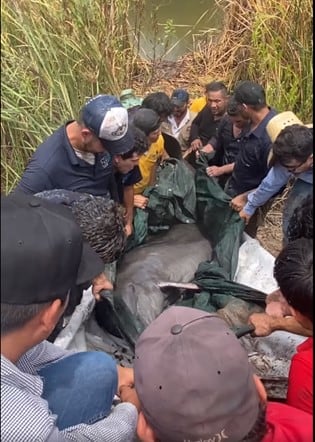 Para poder transportarlo, el primer paso fue contener al delfín al interior de una red, debido a su peso, tuvieron que intervenir más de 10 personas para lograr sacarlo del drenaje.