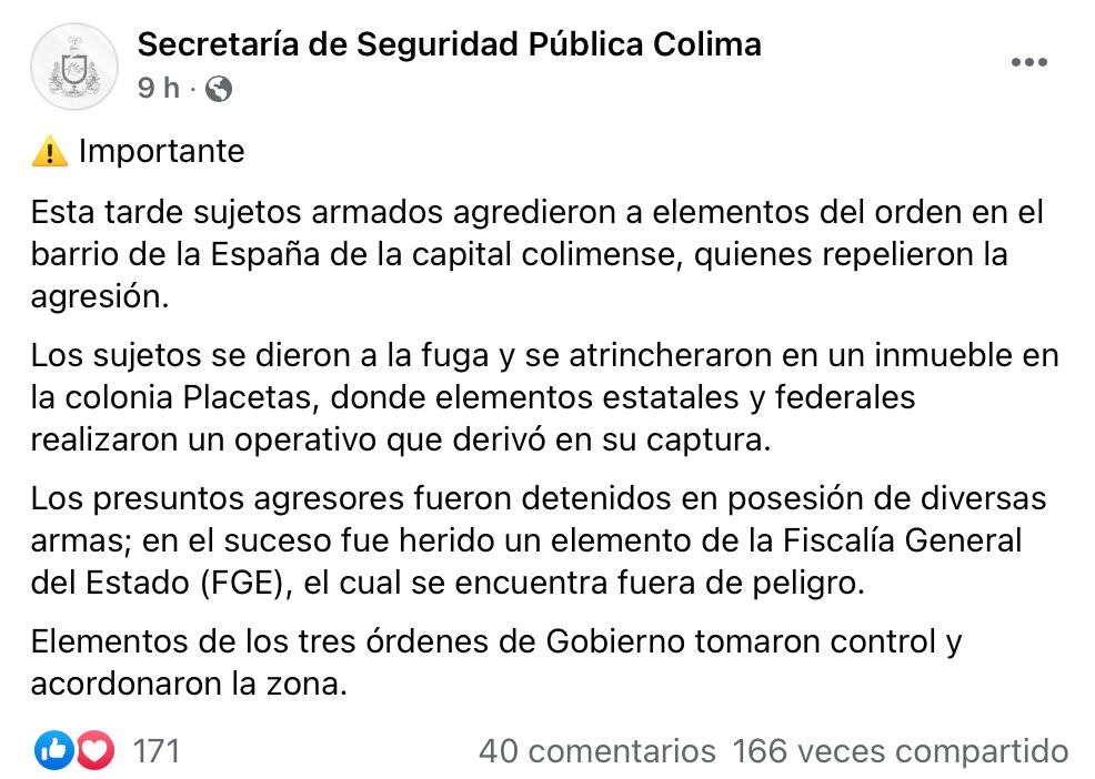 El grupo armado que inició la balacera en Colima intentaron huir en cuanto la policía comenzó a repeler la agresión.