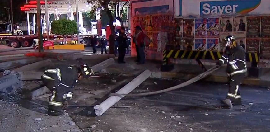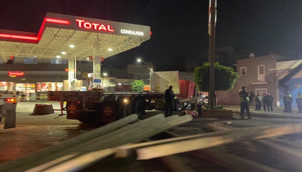 Un tráiler que transportaba postes de concreto chocó contra una gasolinera en Circuito Interior la mañana del 24 de mayo, a la altura del la estación del Metro Oceanía.