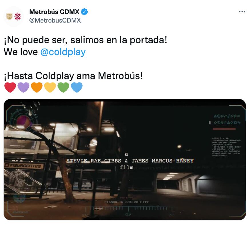 Por su parte, el Metrobús compartió una imagen donde se puede ver la estación Insurgentes y aseguró que “hasta Coldplay ama Metrobús”.