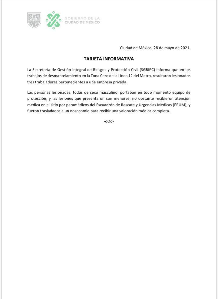 La Secretaría de Gestión Integral de Riesgos y Protección Civil (SGRIPC) del Gobierno de la CDMX informó que tres trabajadores resultaron lesionados: