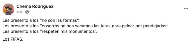 “Les presento a los 'no son las formas'. Les presento a los 'nosotros no nos sacamos las tetas para pelear por pendejadas'. Les presento a los 'respeten mis monumentos'. Los FIFAS".
