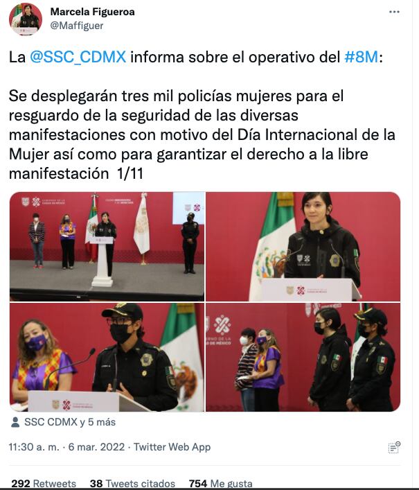 Por su parte, la Secretaría de Seguridad Ciudadana de la Ciudad de México (SSC-CDMX) informó que implementará un operativo por el Día Internacional de la Mujer.