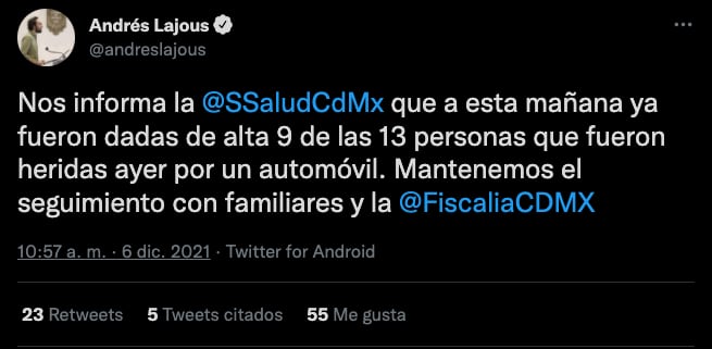 “Nos informa la @SSaludCdMx que a esta mañana ya fueron dadas de alta 9 de las 13 personas que fueron heridas ayer por un automóvil. Mantenemos el seguimiento con familiares y la @FiscaliaCDMX”
