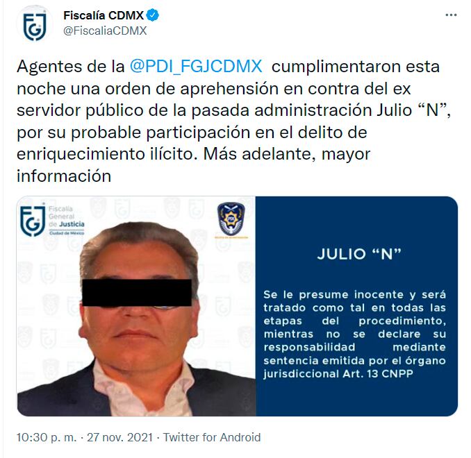 En un mensaje a medios el vocero de la Fiscalía General de Justicia de la CDMX, Ulises Lara López, dijo que la detención de Julio Serna, identificado como Julio “N”, fue debido a la información aportada por un testigo identificado como Miguel Ángel “N”, quien actualmente se encuentra bajo proceso penal.