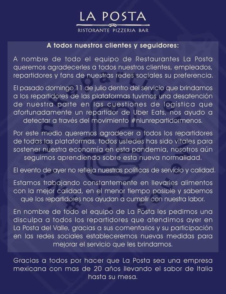 El restaurante italiano La Posta, a través de un comunicado publicado en sus redes sociales, se disculpó por la desatención en la logística de la entrega de pedidos del 11 de julio.