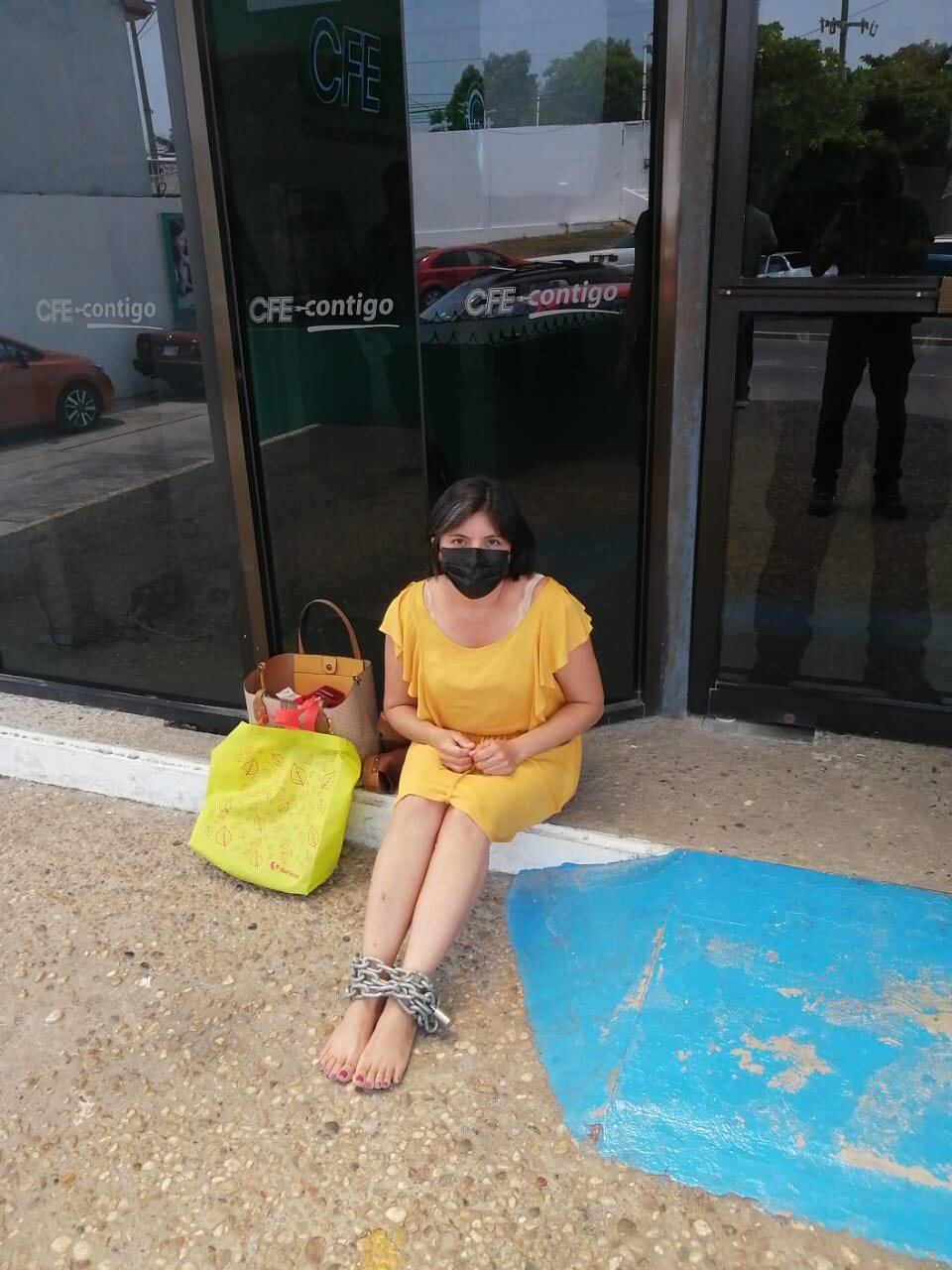 Una mujer, identificada como Lourdes Saya decidió encadenarse de manera simbólica frente a las oficinas de la CFE en Villahermosa, Tabasco.