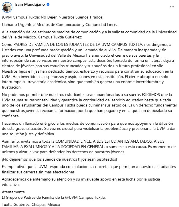 En la misiva, padres de estudiantes de UVM Campus Tuxtla, Chiapas, manifestaron que se encuentran con preocupación, por lo que realizaron un llamado de auxilio ante su situación.