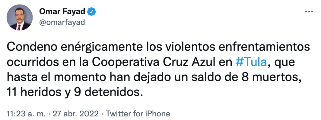 Omar Fayad condena enfrentamiento en cementera de Tula; hay 9 detenidos por los hechos