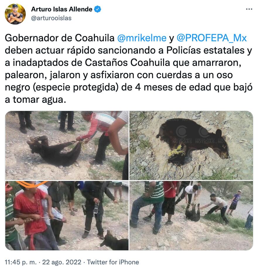 Arturo Islas pidió a Miguel Riqueme que se sancione a los policías que maltrataron y permitieron el abuso a un osezno en Castaños, Coahuila.