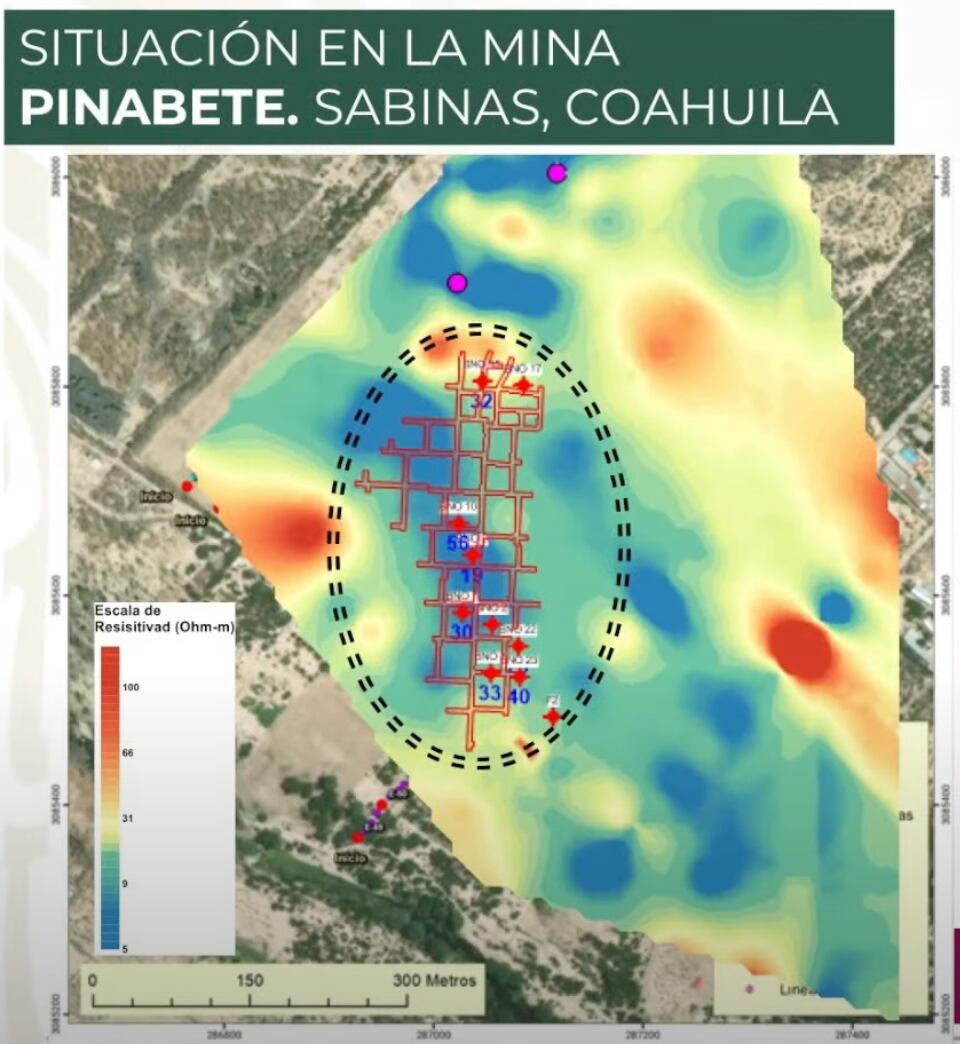 Por otra parte, la titular de Protección Civil informó que, de acuerdo con el mapa de la situación de la mina, la exploración geofísica, se logró definir las zonas que conectan con la mina Conchas norte.