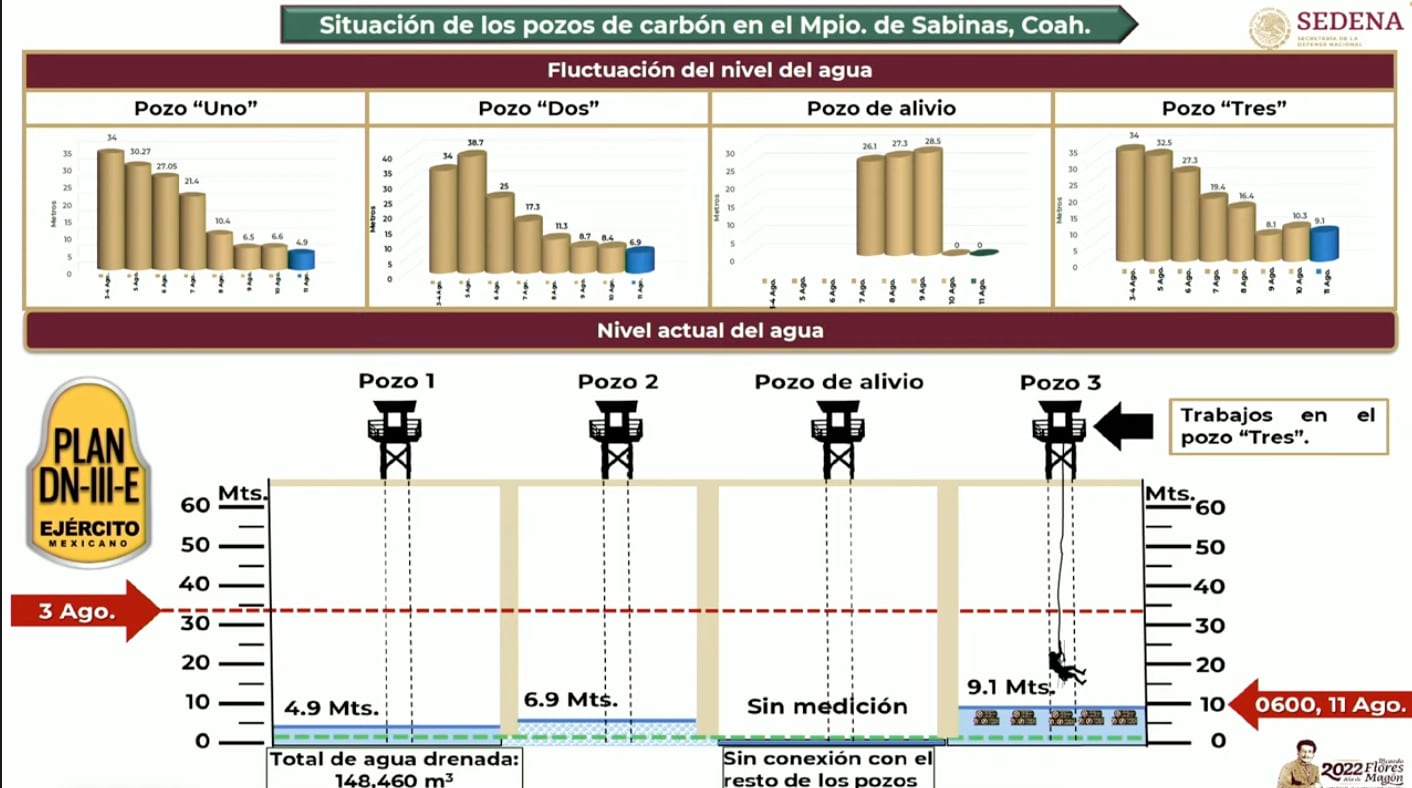 Por otra parte, Laura Velázquez compartió cuál es el nivel del agua que hay en los pozos de la mina Pinabete, al corte de las 3:00 horas del día 14 de los trabajos de rescate.