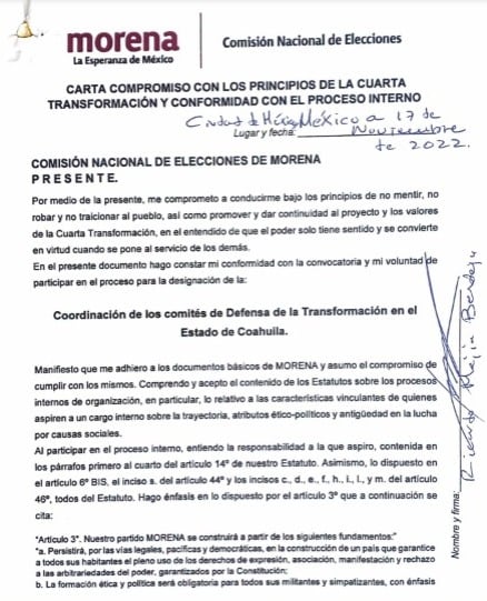 La carta compromiso que firmó Ricardo Mejía Berdeja, apenas el 17 de noviembre de 2022, es por los principios de la Cuarta Transformación y conformidad con el proceso interno de Morena para elegir a su candidato a la gubernatura de Coahuila, es decir, la encuesta.