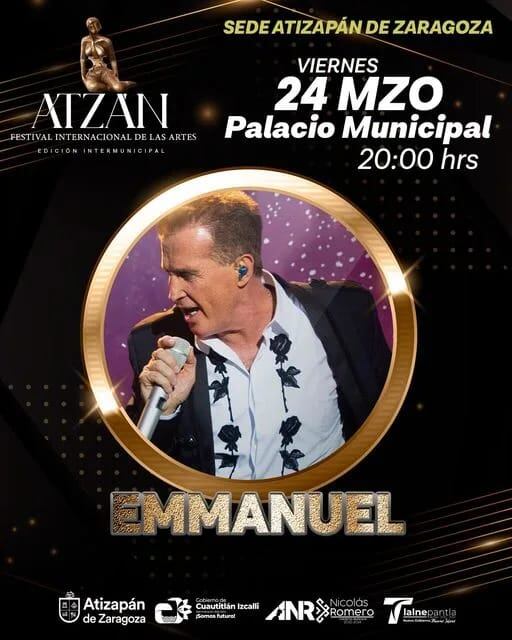 Festival Internacional de las Artes Atzán 2023, Edición Intermunicipal, será abierto por el cantante Emmanuel en el Palacio Municipal de Atizapán de Zaragoza este viernes 24 de marzo, en el horario de las 20:00 horas.