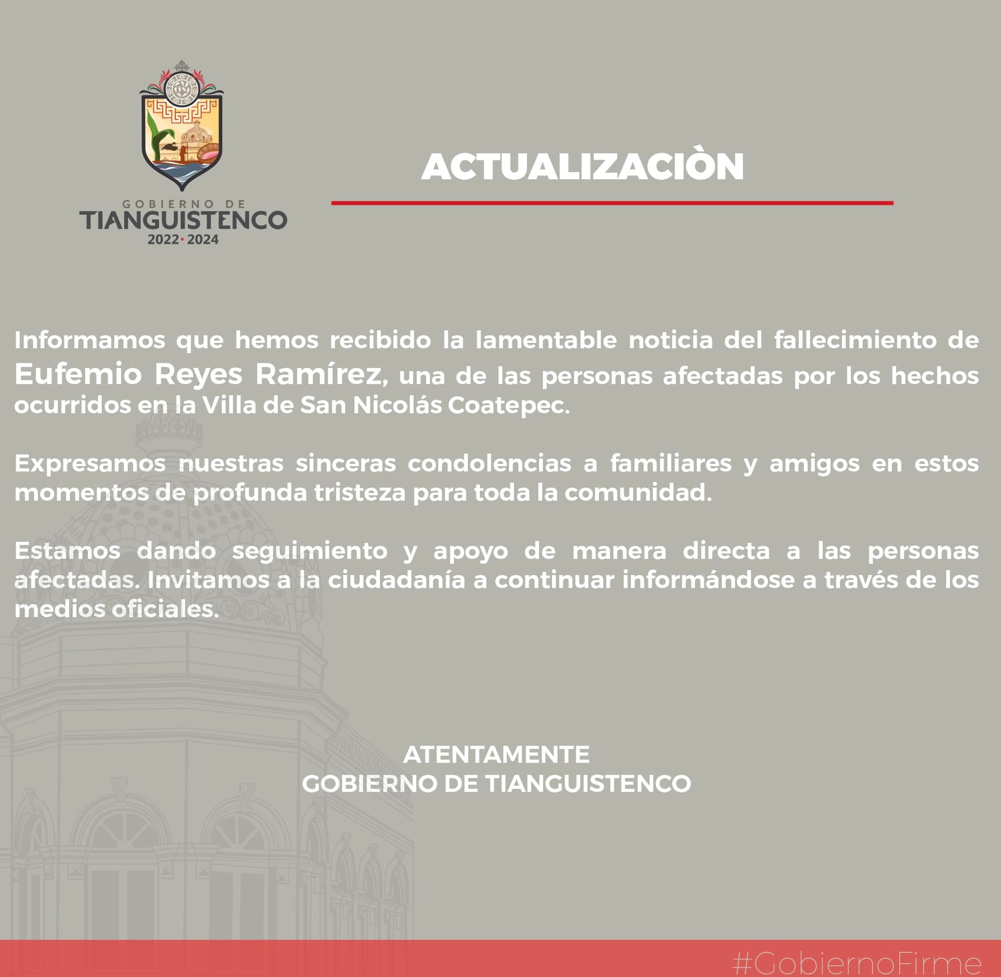 Asimismo, el gobierno de Tianguistengo, Estado de México compartió que, desde el momento del accidente se ha brindado apoyo de manera directa a los familiares de las personas heridas durante la fiesta patronal en Villa de San Nicolás Coatepec.
