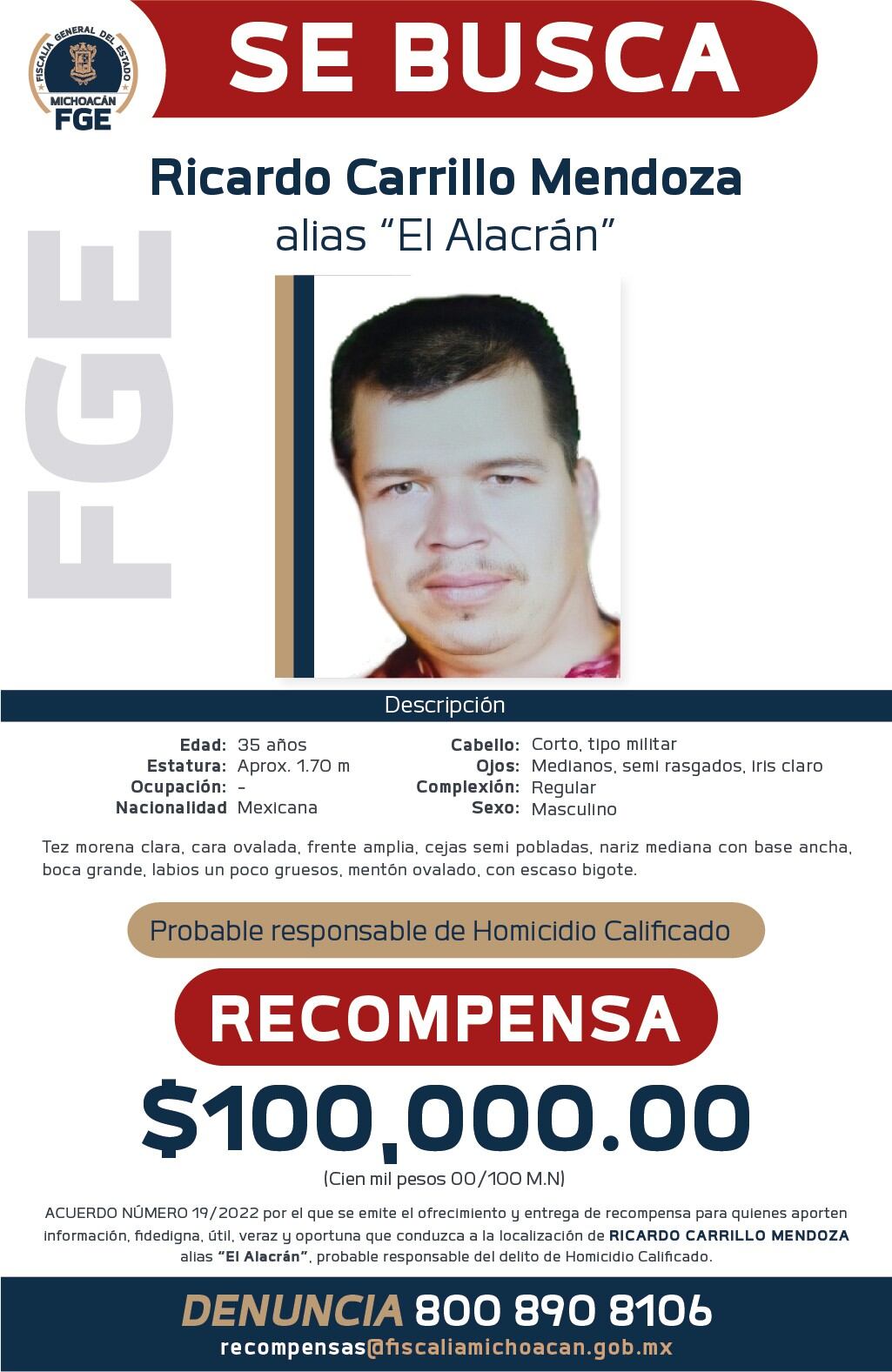 De acuerdo con las autoridades, se otorgará este incentivo económico a quienes proporcionen información útil y fidedigna que lleve a la detención del hombre identificado como Ricardo Carrillo Mendoza “El Alacrán”.