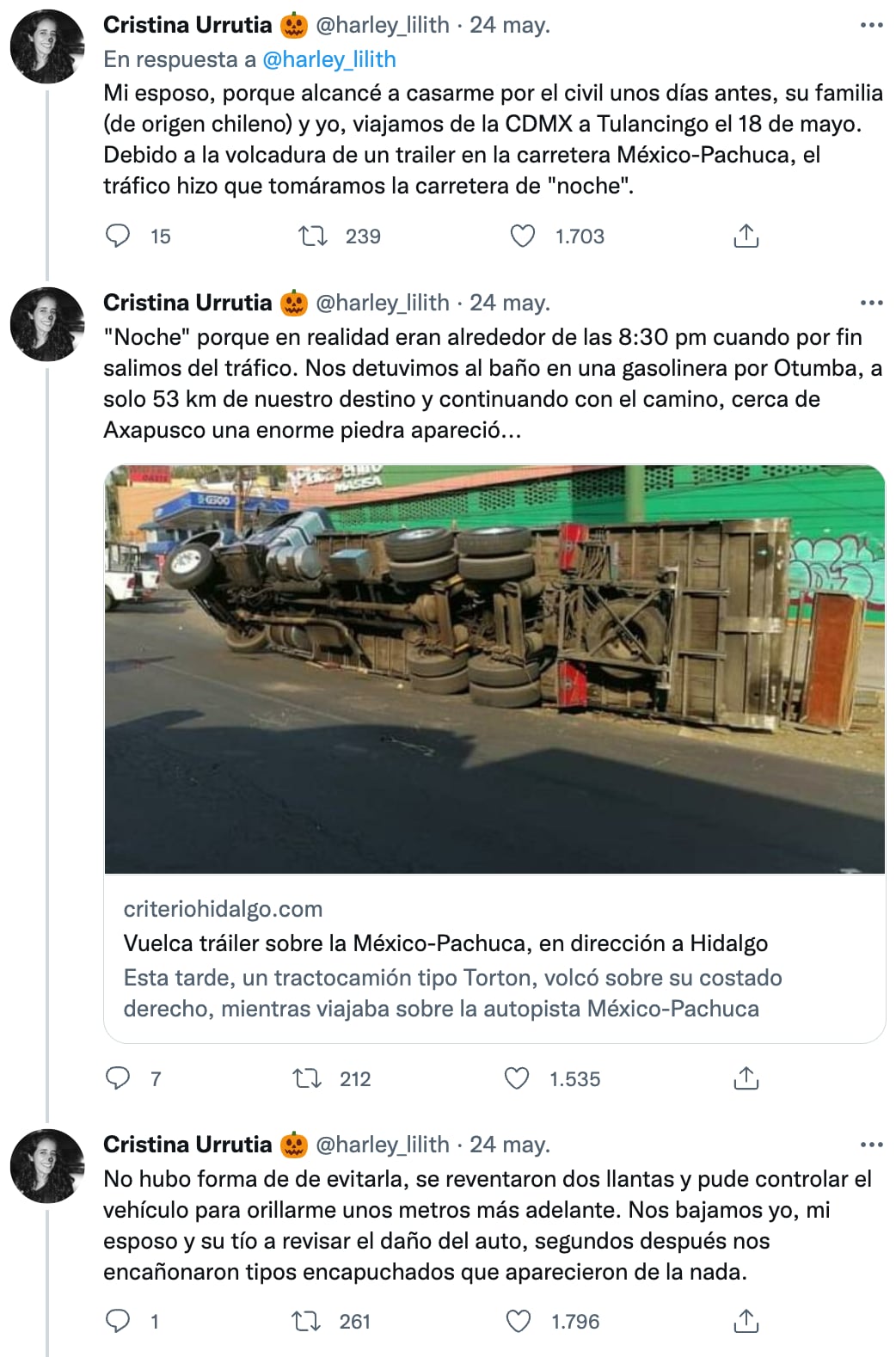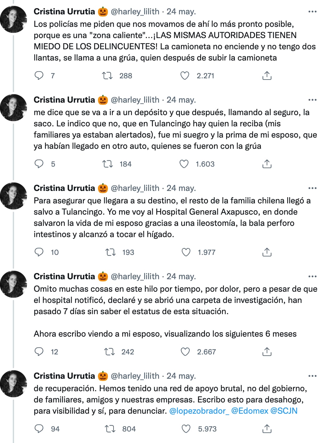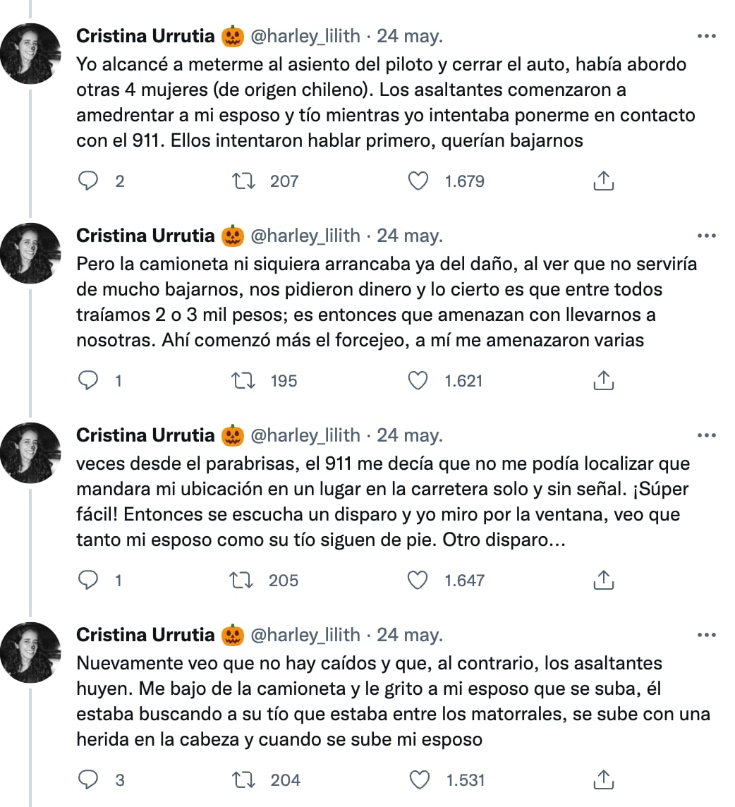 En Twitter, narró que viajaba en una camioneta con su esposo, un tío y 4 mujeres más, todos excepto ella de origen chileno, hacia el lugar donde se realizaría la ceremonia.