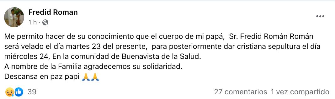 Asimismo, agradeció la solidaridad de la comunidad hacia la familia de Fredid Roman y deseó que su papá descanse en paz.